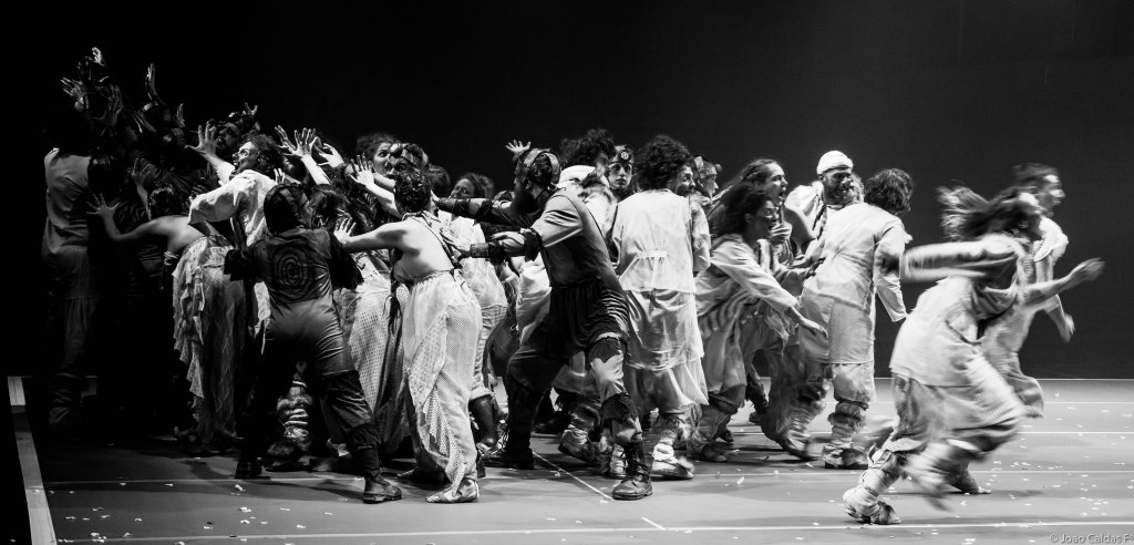 Com 45 atores em cena, música ao vivo e dramaturgia de Cássio Pires, “Diásporas”lança um olhar sobre os deslocamentos populacionais criando três povos fictícios pertencentes às culturas do Mar, da Montanha e do Deserto